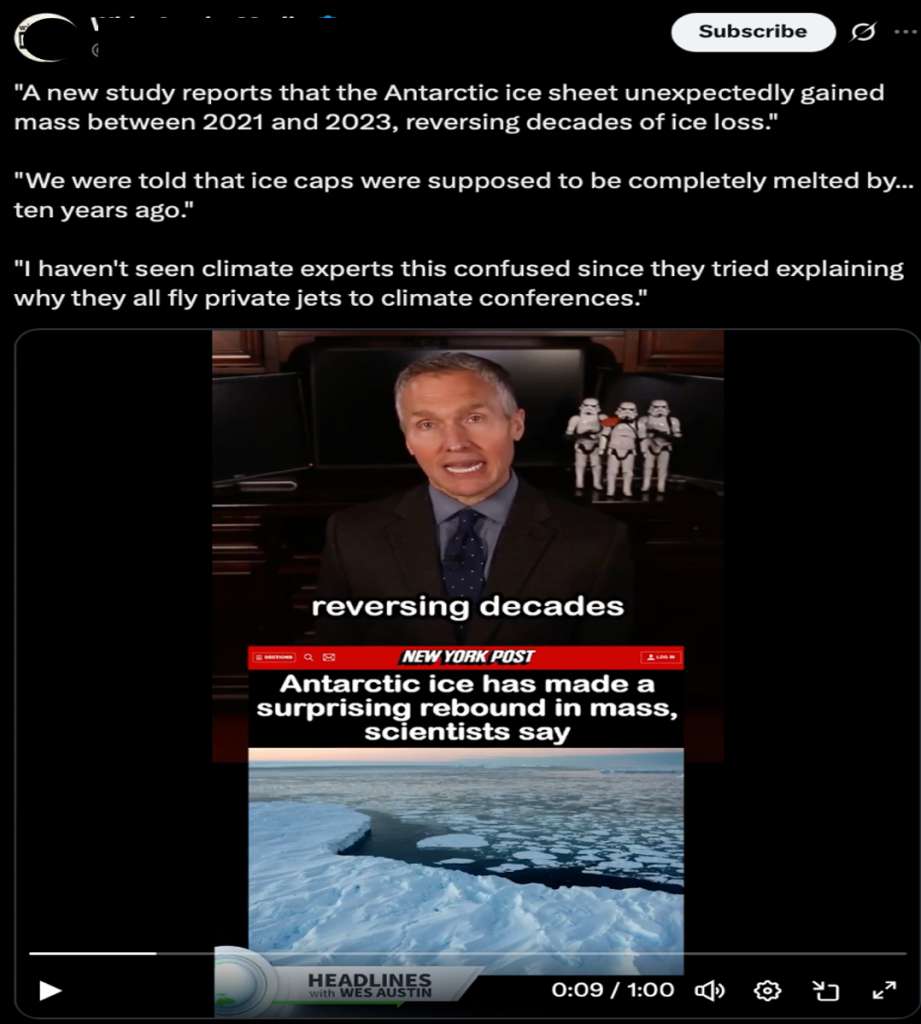 We came across a post on X with the claim that the ice sheets in Antarctica are gaining mass, reversing the effects of climate change over the past two decades. This has allegedly left experts “confused,” implying that climate change may not be real.