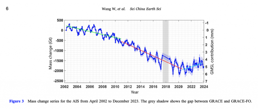 [The mass changes observed by researchers from Tongji University between 2002 – 2024, including a gradual increase between 2020 – 2023, taken from their report.]