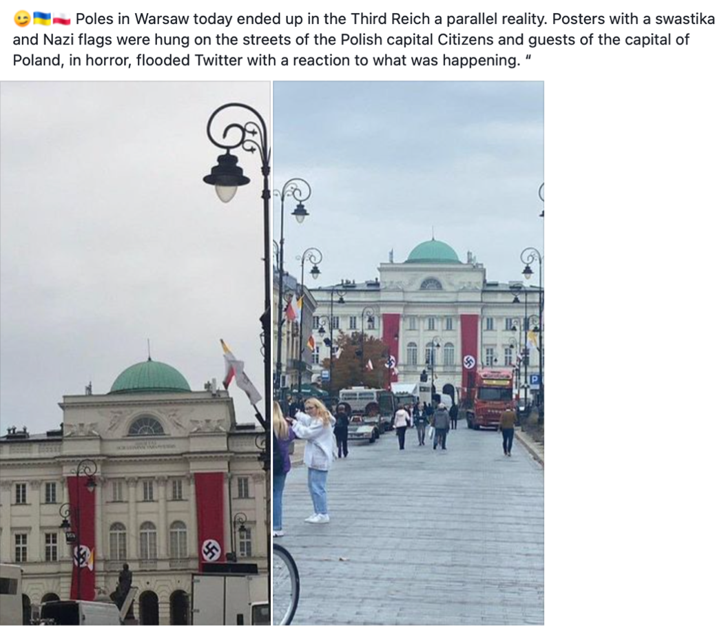 As can be seen, Nazi imagery is hung from the building in Warsaw, Poland. The post also claims that guests and citizens of Warsaw has flooded Twitter with a reaction to what was happening with multiple tweets commenting on the Nazi imagery present.