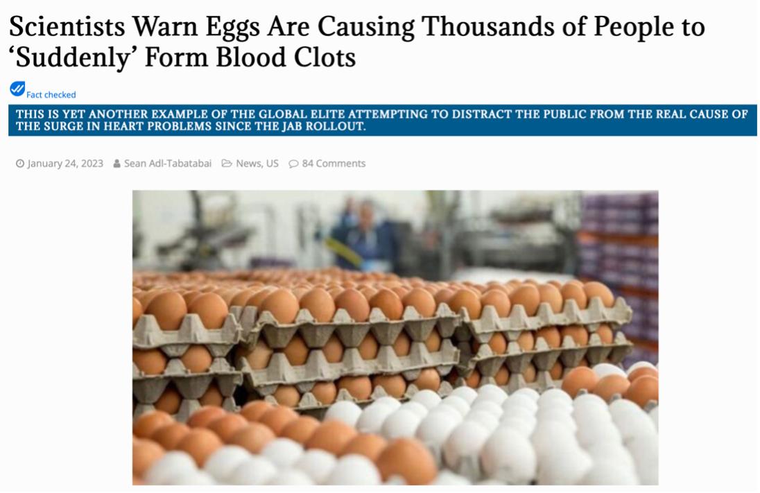 According to this latest claim, scientists have warned that eggs are causing thousands of people to suddenly form blood clots. The article correlates these “findings” with  “the global elite attempting to distract the public from the real cause of the surge in heart problems since the jab rollout”.