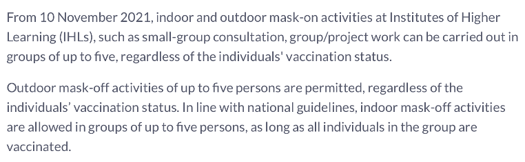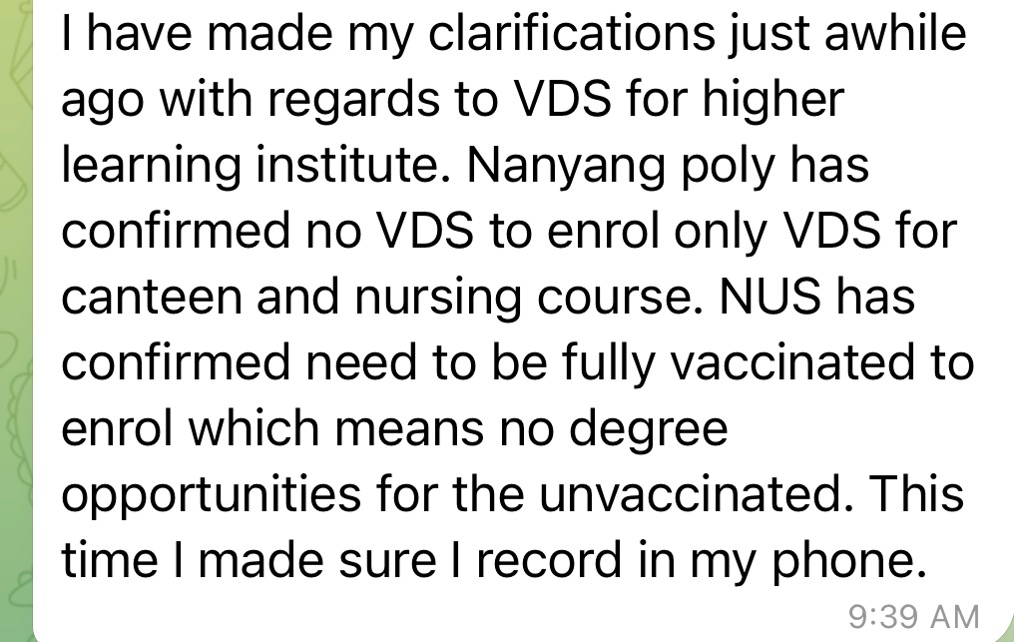 When we conducted our research on this, we found that while there was no information available on vaccination requirements for enrolling, there were guidelines present for VDS in universities. According to the FAQ page on COVID-19 related matters from the Ministry of Education (MOE), indoor and outdoor mask-on activities as well as outdoor mask-off activities for Institutes of Higher Learning (IHLs) were not vaccine differentiated, with the only requirement being that they had to be limited to groups of five.