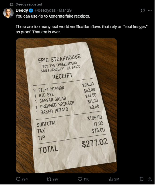 A post circulating on X/Twitter claims that the image generation feature in ChatGPT-4o—the latest large language model (LLM) from OpenAI—can create realistic fake receipts, raising concerns about potential misuse for fraud.