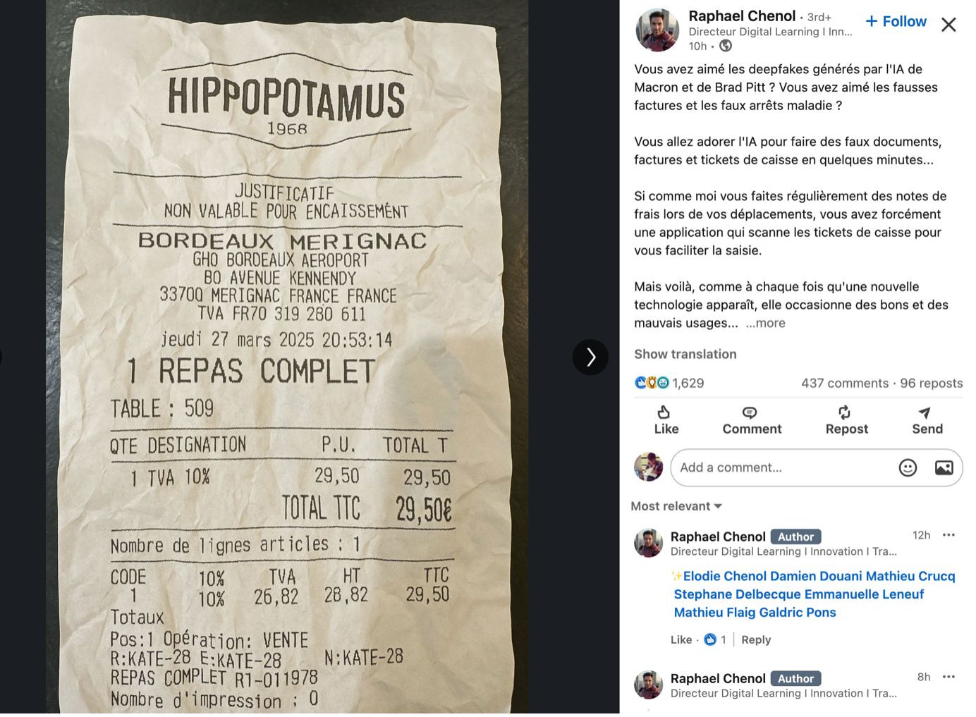 A more compelling example came from a LinkedIn post by a French user, who reportedly asked ChatGPT to edit the text of a real restaurant receipt. The result was far more realistic, as it used an actual photo as the base—making the final output much harder to detect as fake.