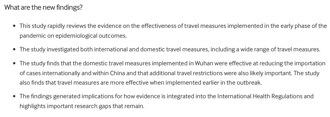 Due to the recency of the variant, there is a lack of information on Omicron and the impact of travel bans on its transmissibility. Hence, we conducted research using pre-existing studies on the impact of travel bans in controlling Covid-19 outbreaks catalysed by new strains of the virus. We found that several research journals had conducted studies on the impact of travel-related measures to curb the spread of Covid-19 in the early phase of the outbreak. While travel restrictions vary across a spectrum, from full border closures to imposed quarantines and vaccinated travel lanes with varying levels of restrictiveness, current studies have shown mixed views on the efficacy off travel-ban restrictions in containing the spread of Covid-19. The follow screenshots, from the British Medical Journal on Global Health and BioMed Central respectively found different levels of efficacy with respect to the impacts of travel restrictions on limiting Covid-19 transmissions.