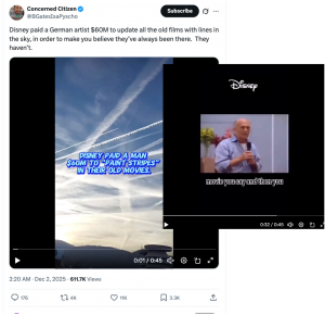 A post on social media has been going viral with the claim that Disney paid $60 million to a German artist to “paint stripes” in their old movies. According to the post and accompanying video, this is an attempt to “make you believe” lines in the sky (implied to be chemtrails) have always existed and are a normal part of daily life.
