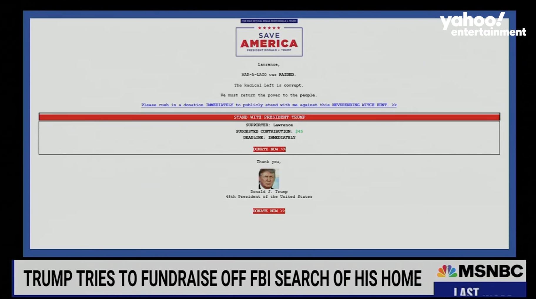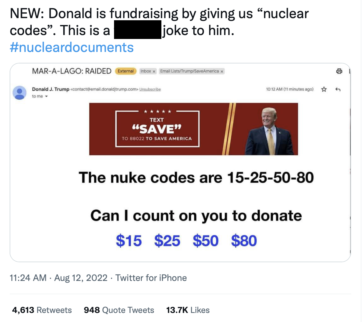 The claim, circulating days after the FBI had raided the former US president’s Mar-a-Largo home, reportedly looking for nuclear documents among other confidential classified items taken by Trump when he left the White House, came after news that Trump had sent an email and text messages asking for donations after the raid.