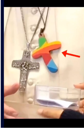 While the LGBTQ+ flag and the Latin American Youth Ministry cross do share some similarities, namely that they are both extremely colourful, the claim that the Pope wore a colourful cross in support of the LGBTQ+ community is false. The cross worn by the Pope was in fact in support of the Latin American Youth Ministry.