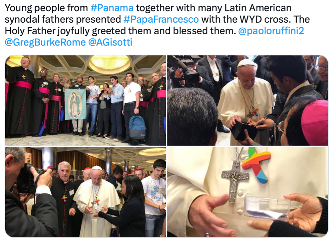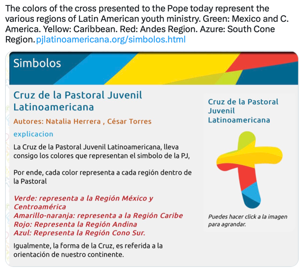 A second tweet from the news outlet states that the colourful cross is the Latin American Youth Ministry cross with each of its colours represent the various regions of Catholic youth ministries found in Latin America. Yellow represents the Caribbean for example, with red representing the Andes region.
