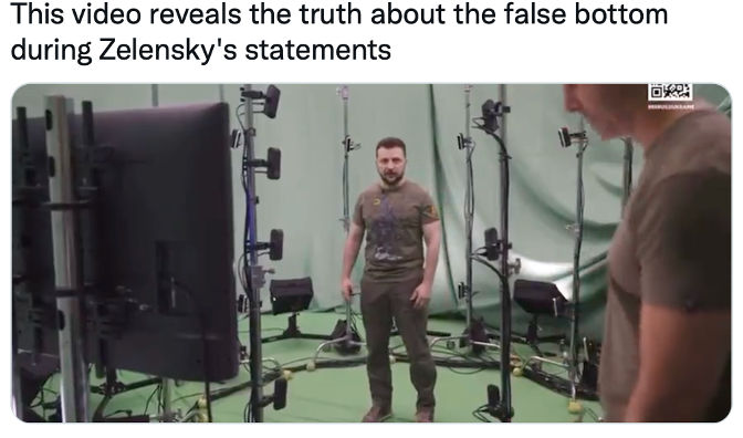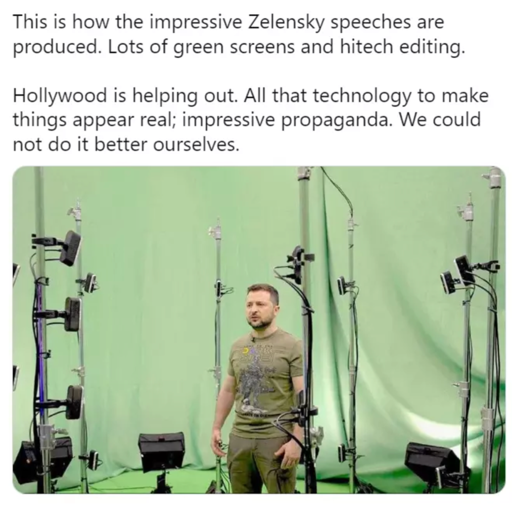 Since the beginning of the war in Ukraine, misinformation campaigns have falsely accused Zelenskyy of fleeing the country. To further promote this narrative, these images attempt to prove that the president films his videos addressing the Ukrainian people in front of a green screen in a studio, instead of on the ground as the footage released by the Ukrainian Presidency alleges to show.