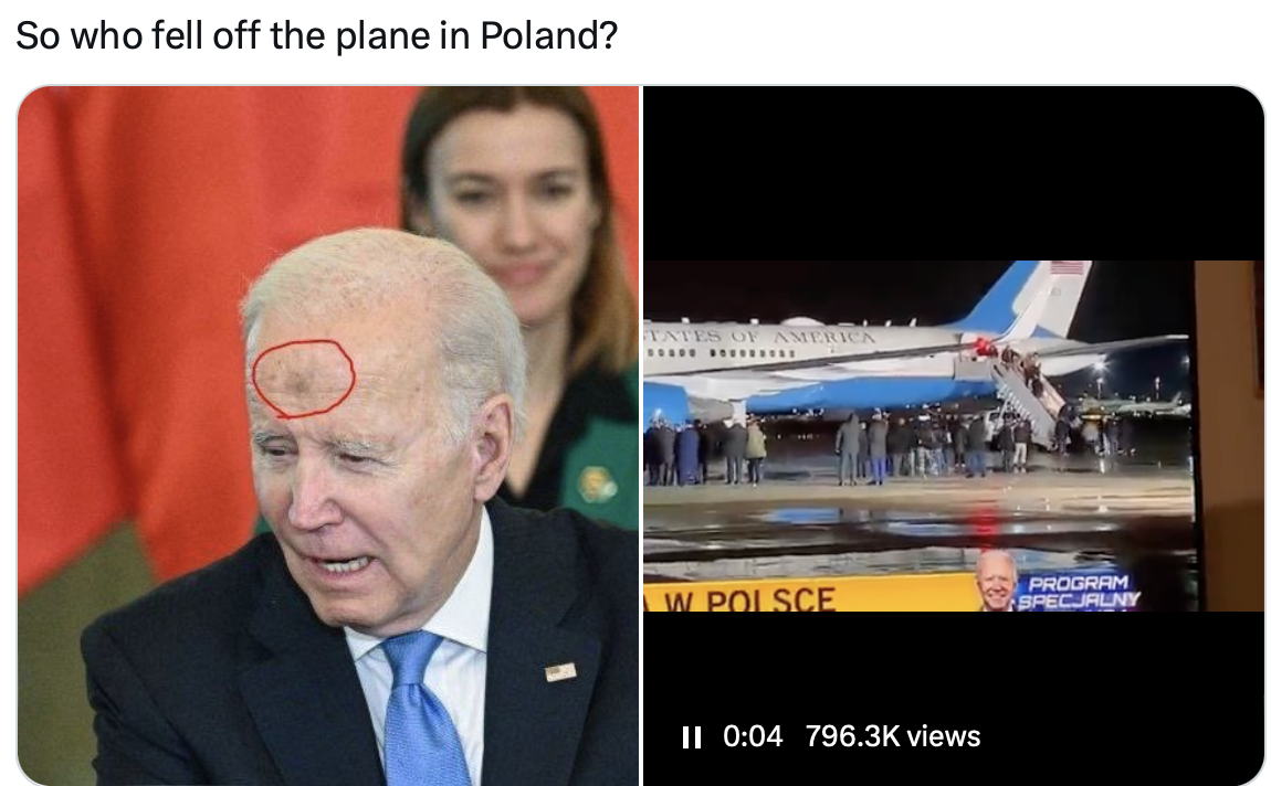 The posts, which were in turn used to question his physical and mental health and ability to serve as President came after he tripped and fell while attempting to board Air Force One as he left Poland on Feb. 22, 2023.