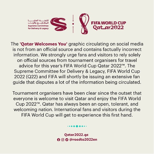 Meanwhile, the official Qatar World Cup Twitter account released a statement that the poster on October 7 that the poster is not an official 2022 World Cup document and contains factually incorrect information. Additionally, the Supreme Committee for Delivery & Legacy, FIFA World Cup 2022 (Q22) and FIFA will shortly be issuing an extensive fan guide that disputes a lot of the information being circulated.”
