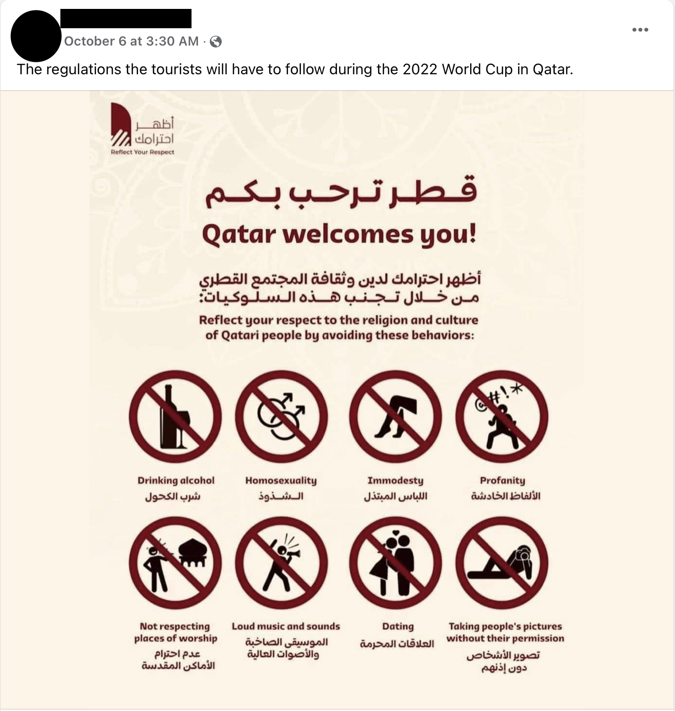 The post claims to show the regulations tourists will have to follow during the 2022 FIFA World Cup scheduled to be held in Qatar between 20 November and 18 December. The sporting event which will be the first World Cup held in Winter has dealt with a great deal of controversy, including but not limited to allegations of human rights abuses along with bribery and corruption in the 2022 World Cup bidding process.