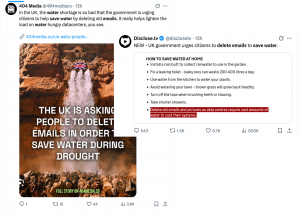 Recently, several posts have been circulating on X claiming that the UK Government is “urging citizens to delete emails to save water.” Some posts further claim that doing so could save “thousands of tons” of water by lightening the load of data centers, which require water to cool their systems.While it is true that the UK is currently experiencing a water shortage and its National Drought Group has issued recommendations on saving water at home, is it really possible to conserve water by deleting old emails? We looked closer to sort out the facts.