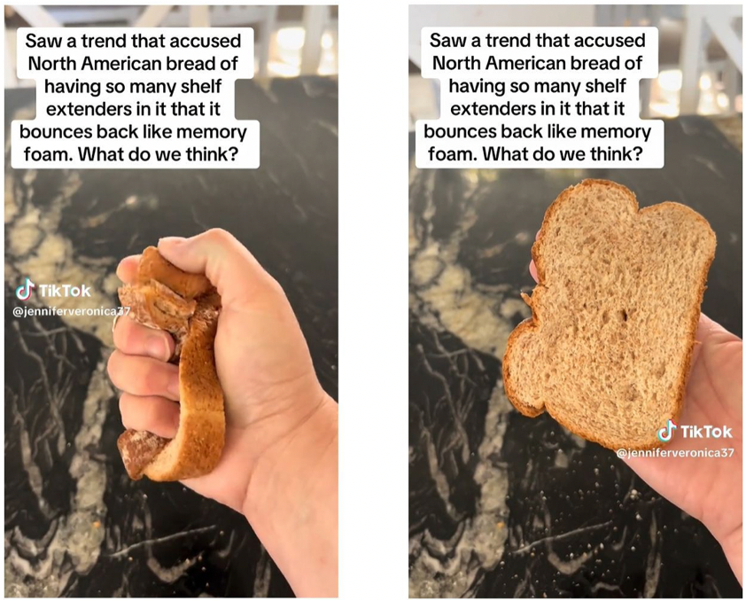 We came across a TikTok trend in which users squash slices of North American sandwich bread and watch them spring back into shape. The videos claim that the bread contains so many “shelf extenders” that it behaves like memory foam.