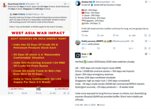 Based on what we could find, the only verifiable statistic in the claim posts is from  Japan (254 days’ worth of oil reserves) and South Korea (200 days) – including national stockpiles, private-sector stockpiles, and joint stockpiles with oil-producing countries. However, none of the other countries mentioned in the claim post have made statements about the exact day-based supply of their oil reserves.Estimates based on data published in reputable journals and by some countries (the US, South Korea, and Japan directly publish detailed data about their oil reserves) instead suggest that the claim is actually using different metrics across the different countries and over-inflating the days for most in order to shape and fit a certain narrative about the situation in India.For instance, while the claim says that the US has 200 days of crude oil supplies, these calculations appear to be made based on total imports rather than actual stock in the Strategic Petroleum Reserve and commercial inventory.