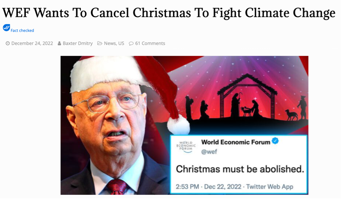 Based on available evidence then, the claim that the WEF launched an initiative to cancel Christmas traditions to save the environment is false. There is no evidence that either the WEF, or the media organisations purportedly under the WEF’s influence, are complicit in an initiative aiming to cancel Christmas holiday traditions.