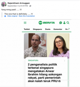 The headline in the screenshot reads, when translated, “two famous Singaporean political analysts say Anwar Ibrahim has lost the people’s support, the ruling party will lose badly in the 16th General Election.”