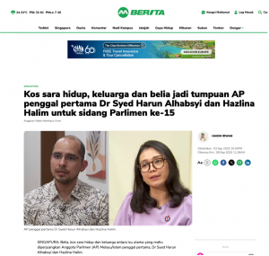 A search of Berita Mediacorp with the politicians’ names led us to an article published on 3 September with the same image and author. However, this article has an entirely different headline. Translated, it reads, “Cost of living, family and youth are the focus of first-term MPs Dr Syed Harun Alhabsyi and Hazlina Halim for the 15th Parliamentary session.”