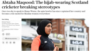 Posts about a cricket game being played by burqa-clad women have been circulating on social media. The image supposedly shows a televised cricket match featuring the Bangladesh women’s cricket team playing against New Zealand. In the image, two women are depicted in full black burqas over cricket shin-pads and gloves.