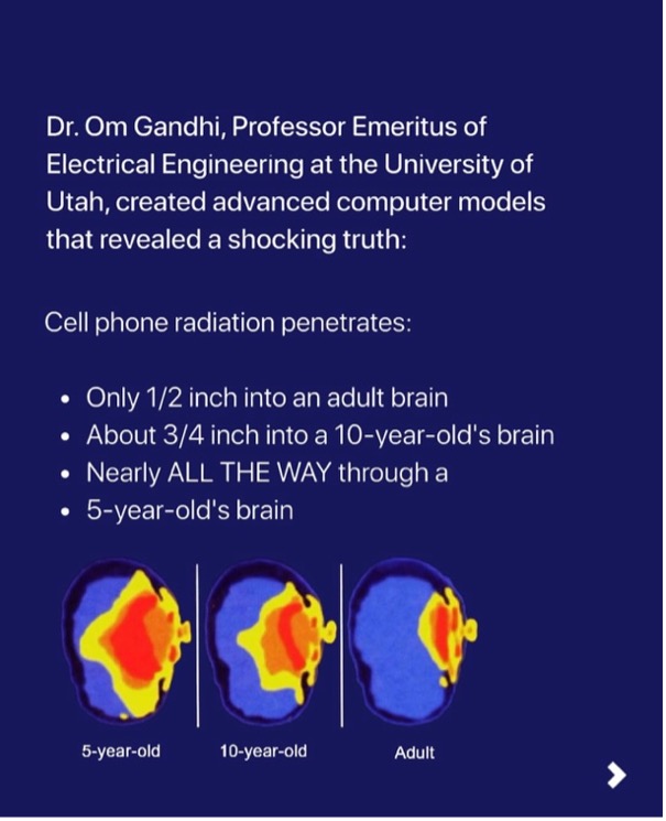 The post cites Dr Om Gandhi, a professor of electrical engineering at the University of Utah, alleging that children should avoid using mobile phones due to health risks. It suggests that as a 5-year-old child’s skull is only half as thick as an adult’s, it allows mobile phone radiation to reach deeper into their developing brain as compared to adults.