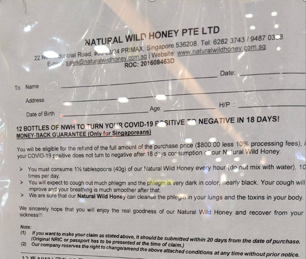 According to the photos, Natural Wild Honey, a retailer that sells honey from Indonesia claims that 12 bottles of its product can turn a person from Covid-19 positive to negative in just 18 days.