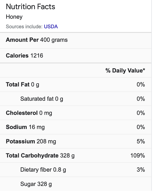 Additionally, from a nutritional standpoint, we strongly recommended not adhering to the honey consumption practices recommended by Natural Wild Honey. It states that people should consume 40g of honey in one hour increments for a total of 10 times, resulting in a total of 400g of honey a day. This amounts to the equivalent of 1216 calories and a whopping 328g of sugar every day. For reference, the American Heart Organization recommends males to have 36 grams of sugar a day, while females are recommended to only have 25 grams.