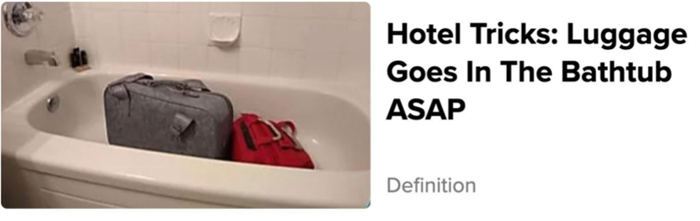 According to the ad, putting luggage in the bathtub is a little known hotel trick that should be done as soon as you check into a hotel room. When we clicked on the advertisement, it led us to a lengthy slide show that never actually discusses the trick of putting luggage in a hotel bathtub, with a number of interesting, albeit largely useless hotel “tricks” presented instead.