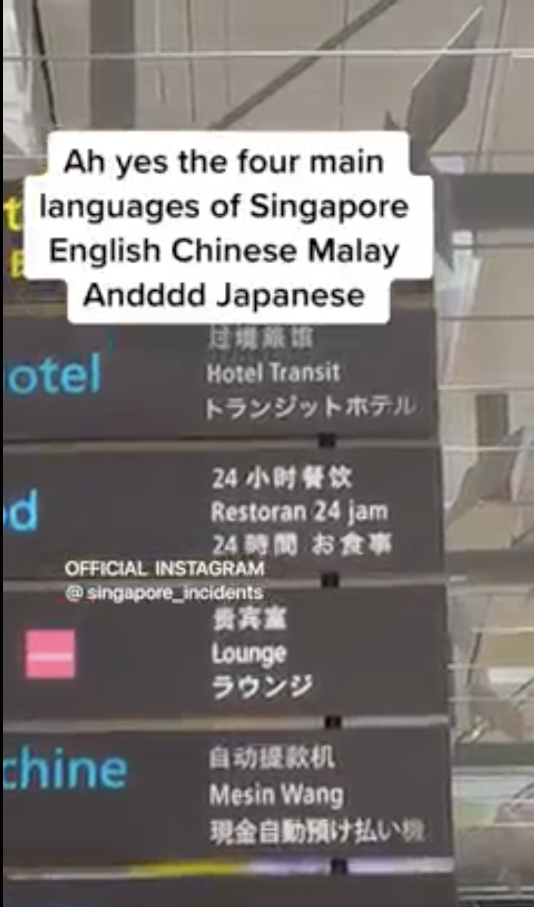 According to the video, filmed in Changi Airport which is Singapore’s major civilian international airport, the directional signage there contains only three of the four official languages of Singapore, omitting Tamil in favour of Japanese.