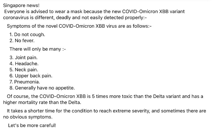 Described as news from Singapore, the post describes the new XBB variant of the Covid-19 virus as being different, deadly and not easily detected, encouraging everyone to wear a mask. It also claims that “of course, the COVID-Omicron XBB is 5 times more toxic than the Delta variant and has a higher mortality rate than the Delta.”