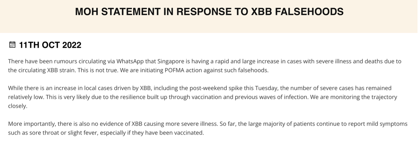 Further research also found a statement from the Singapore Ministry of Health dated October 11 2022 that responds to falsehoods circulating about the XBB strain. In the statement, the Ministry states that there is no evidence that points to XBB causing more severe illness, with the large majority of patients continuing to report mild symptoms.