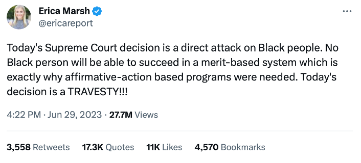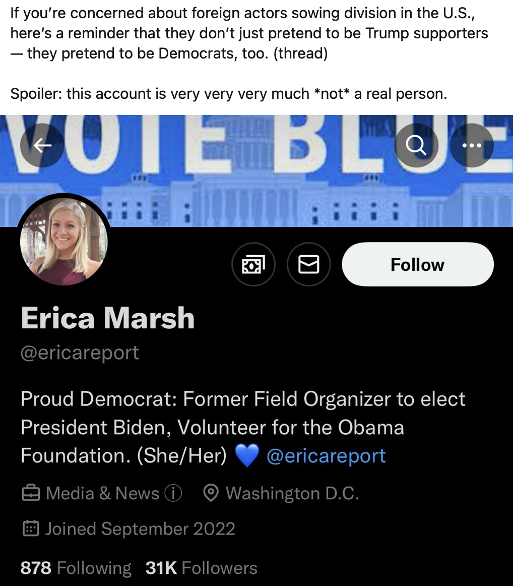 The tweet cites the account of Erica Marsh or ericareport as an example of an account that is not a real person. The account claims to be the account run by someone with that name who identifies themself as a “Proud Democrat: Former Field Organizer to elect President Biden. Volunteer for the Obama Foundation”. For context, ericareport is a largely followed Twitter account known for hyper-liberal tweets that are inflammatory, divisive, or misleading. Her most viral tweet, describing how black people would not be able to succeed in a merit-based system, hence the need for affirmative-action based programs had almost 28 million views before it was taken down.