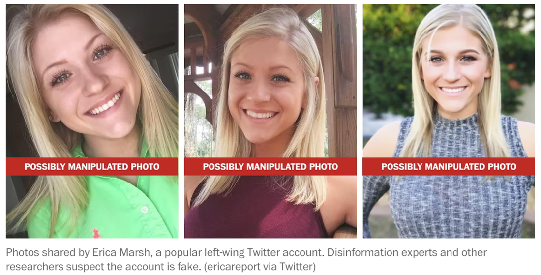 When we looked into the account, we found that Twitter had recently suspended the account amid claims that it was fake, however an archive of the account is still available. We also found an article by the Washington Post detailing how the account might be fake due to her lack of a real-world footprint and her devotion to her “cartoonishly liberal” attention-grabbing viewpoints. Additionally, the photos shared on her Twitter page were flagged as possibly AI manipulated by a digital-imaging expert, who noted that the images bear the hallmarks of digital manipulation.