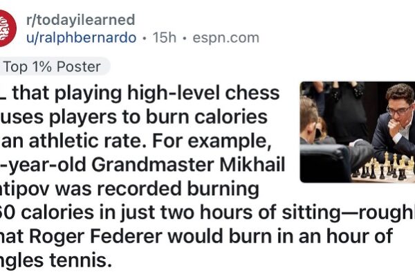 A claim circulating on Reddit asserts that playing high-level chess burns calories “at an athletic rate.” The post cites an ESPN article which reported that Russian grandmaster Mikhail Antipov burned…