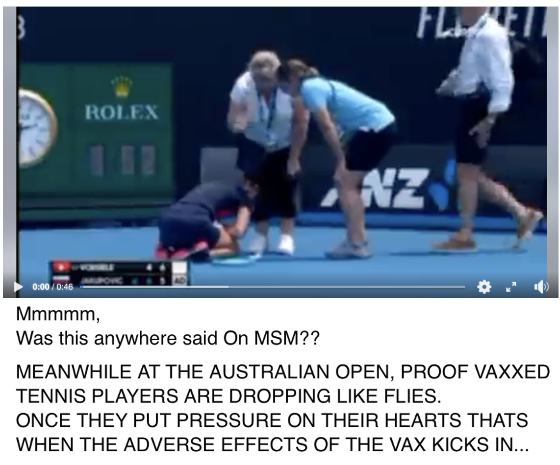 The video shows a tennis player, later identified as Slovenian Dalila Jakupovic on the ground, with the post claiming that vaccinated tennis players are dropping like flies. The caption goes on to say that once vaccinated people put pressure on their hearts, the adverse effects of the vaccine begin to kick in.
