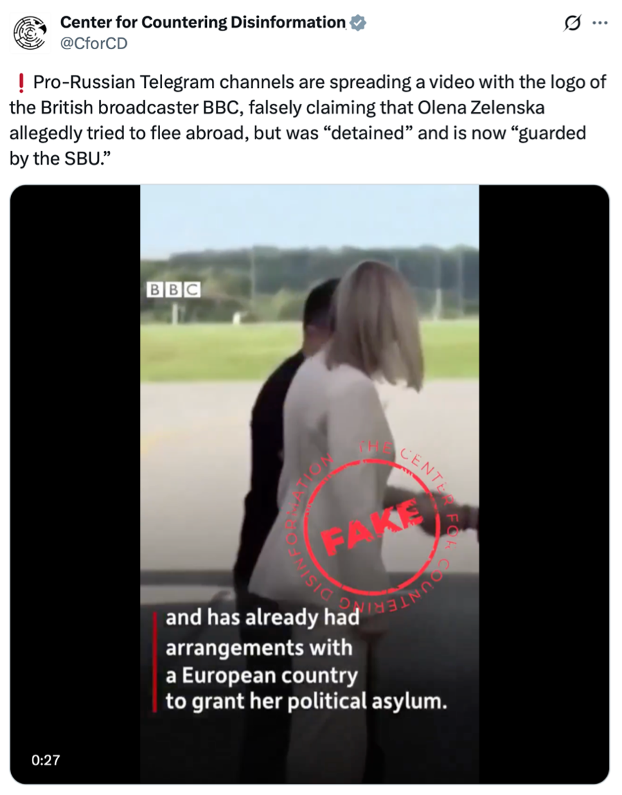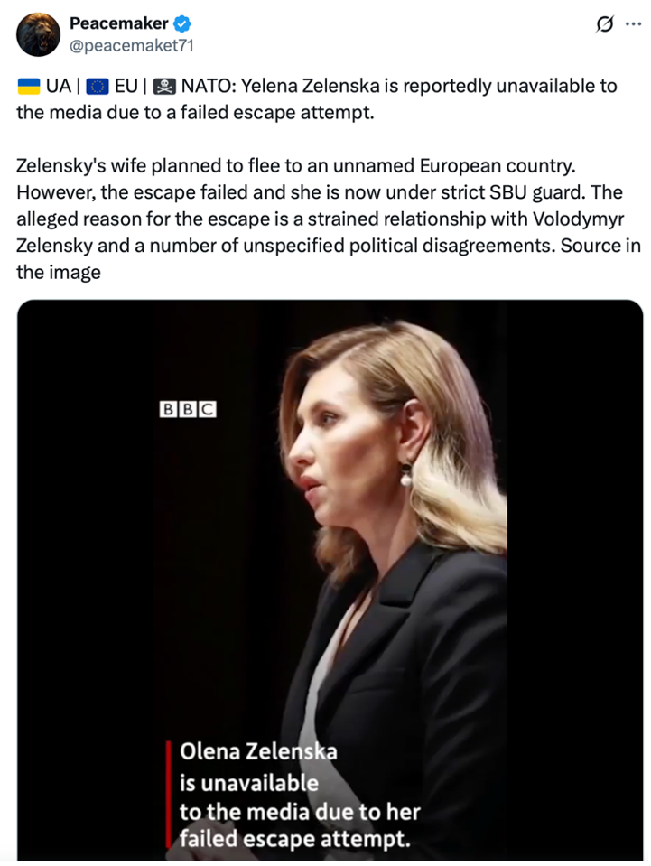 According to the video, Ukraine’s First Lady, Olena Zelenska, was arrested while trying to flee the country. The video, stylised to resemble a BBC News broadcast, alleged that Zelenska had been secretly arranging political asylum in Europe due to a deteriorating relationship with President Volodymyr Zelensky, and that her plan was thwarted by a covert group of handlers from Ukraine’s Security Service, the SBU.