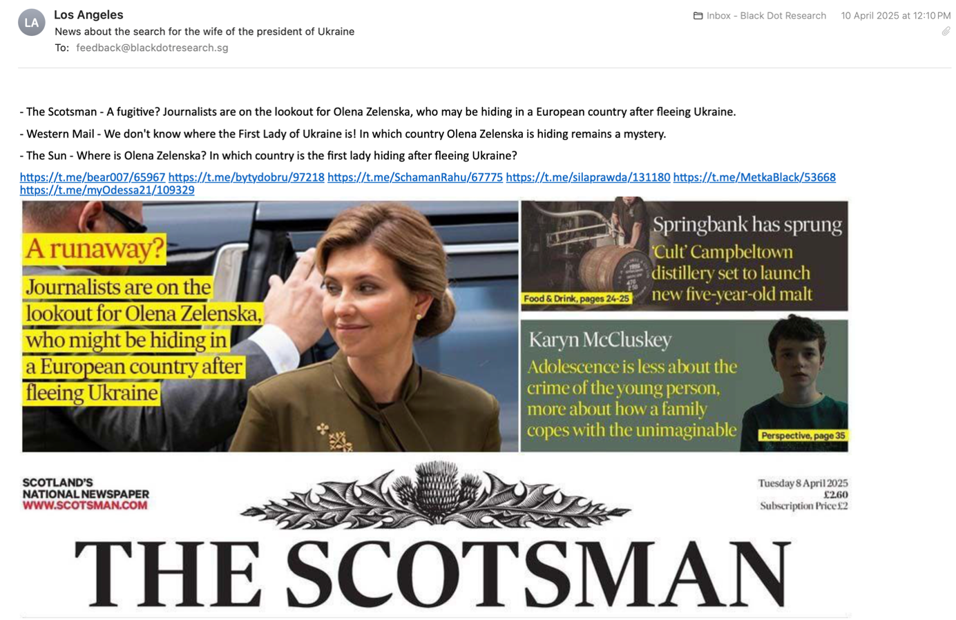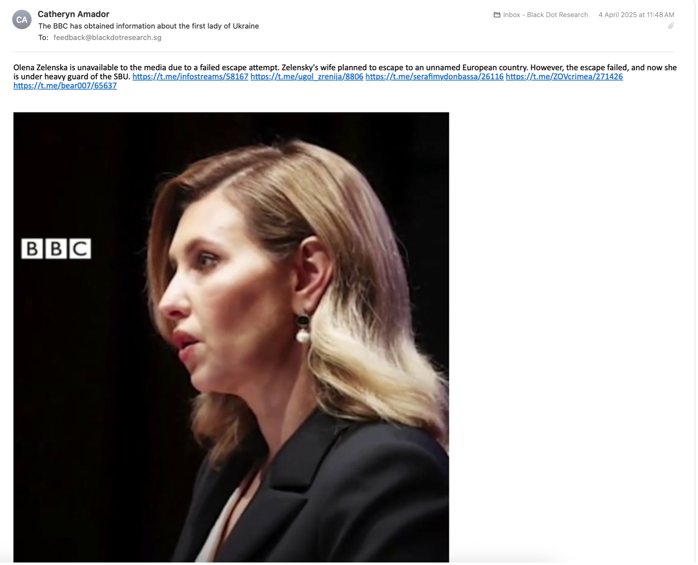 This is not the first time narratives about Zelenska attempting to escape Ukraine have emerged. In recent weeks, multiple emails have been sent to Black Dot Research describing similar claims. These messages appear to be part of a coordinated campaign of disinformation.
