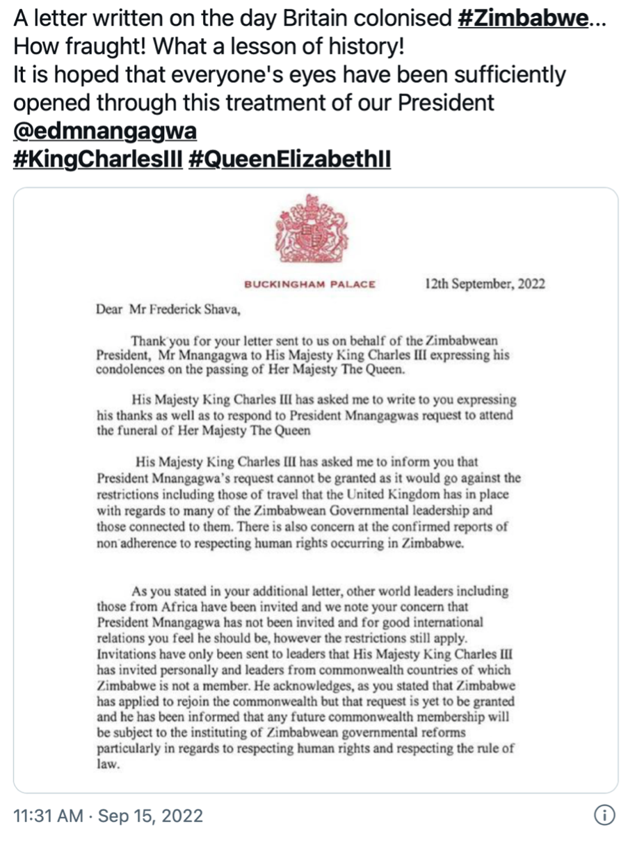 According to the post, which contains a letter allegedly from Buckingham Palace, President Emmerson Mnangagwa of Zimbabwe was rejected from attending Queen Elizabeth II’s funeral.