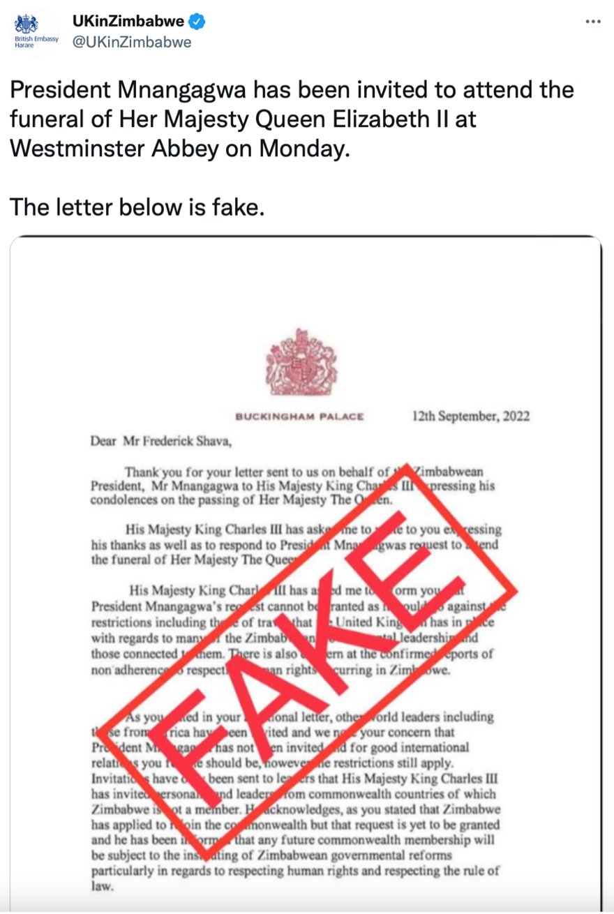 A quick search on this found a tweet from the official account of the British Embassy in Zimbabwe, stating that the letter is fake and President Mnangagwa has been invited to attend the funeral.
